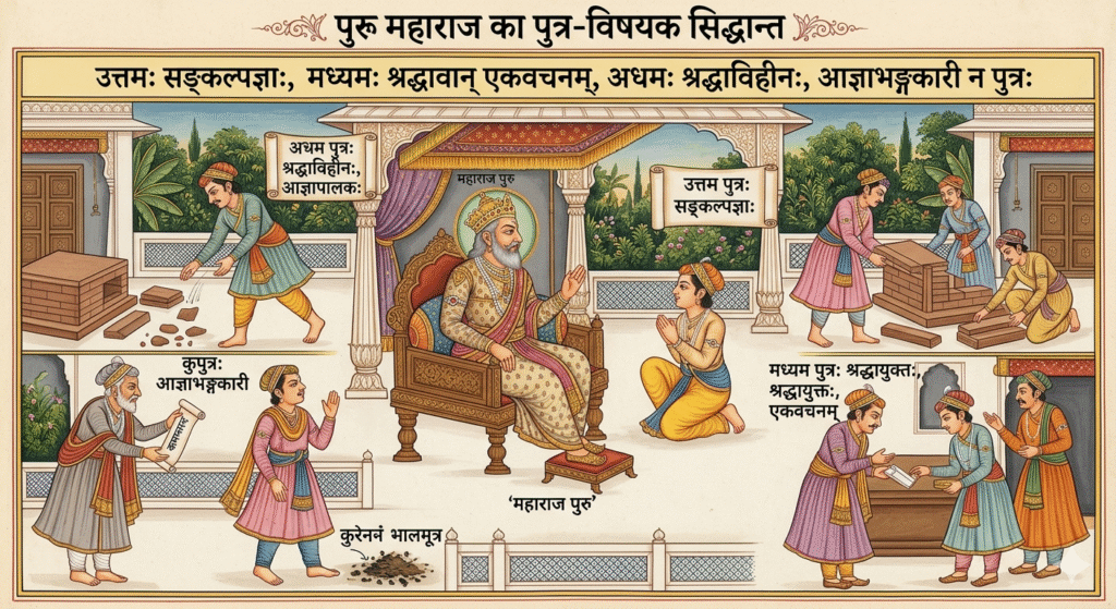 पुरु महाराज का यह सिद्धान्त आज भी हमारे जीवन में अत्यधिक प्रासंगिक है। वे हमें यह सिखाते हैं कि एक पुत्र का कर्तव्य केवल आदेशों का पालन करने तक सीमित नहीं है, बल्कि उसे अपने पिता के प्रति श्रद्धा और सम्मान से भरपूर होना चाहिए। उत्तम पुत्र वह है जो बिना कहे ही अपने पिता के मन को समझता है, जबकि अधम पुत्र वह है जो पिता की आज्ञा को न केवल नकारता है, बल्कि उसे अपमानित भी करता है।